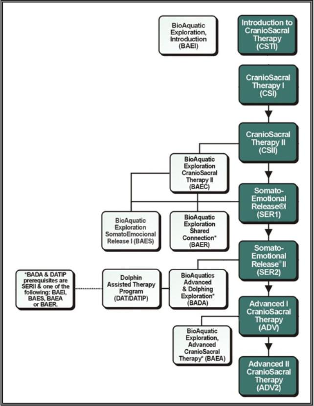 Os cursos do currículo da BioAquática da TCS, foram desenvolvidos por Kat e Chas Perry e acontecem nas Bahamas, durante os meses de Junho a Setembro. Os cursos são vinculados ao Upledger Institute, e fazem parte dos cursos extra-curriculares da TCS e da LSE. O formato dos cursos é muito parecido, sendo que todos oferecem, no primeiro dia, um nado com os golfinhos, para conhecê-los. No terceiro dia há uma oportunidade de tratamento com os golfinhos em todos os cursos de mais de 2 dias. Nos outros dias há o trabalho nas macas, nas piscinas e/ou no oceano, em locais ao redor do local do curso, ou em praias ou ilhas distantes, depois de uma viagem de barco.